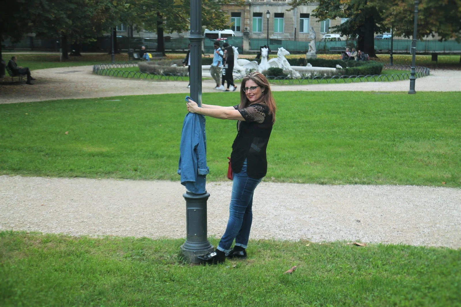 היום אני בג'ינס סקיני, גופיית טוניקה לבנה וחולצת ג'ינס פתוחה שמוסיפה שיק ואת הצבע הוספתי בצעיף ותיק בצבע הבורדו שכמובן מקפיץ את ההופעה.