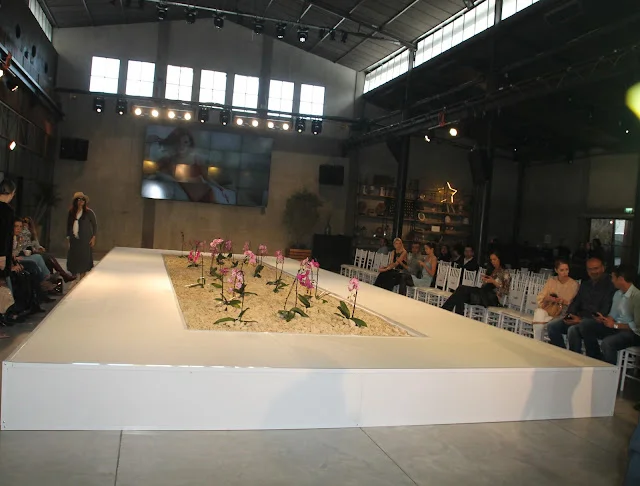 הדוגמניות צעדו מסביב לפאטיו לבן עם סחלבים סגולים ורודים .