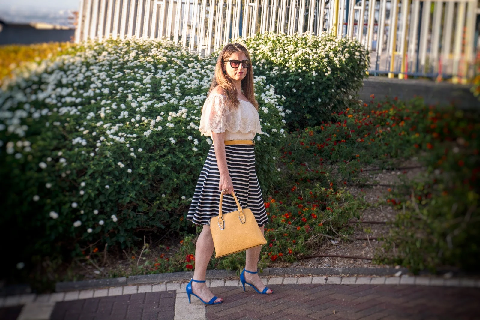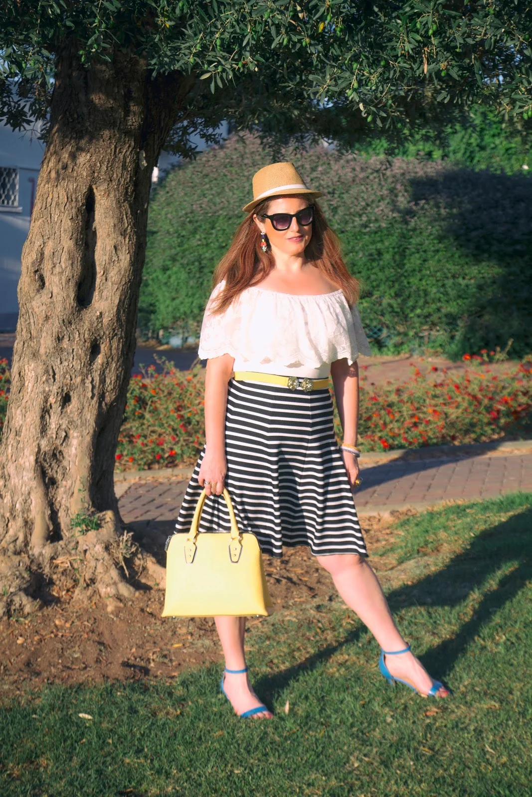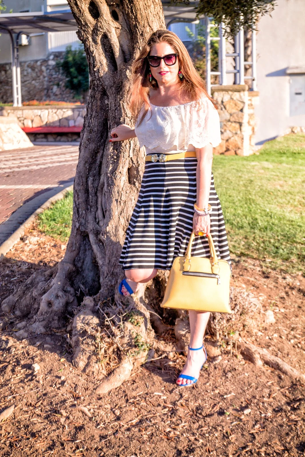 בחרתי בחצאית – גזרה A ובחולצה שהעונה אי אפשר לפספס – מחשוף הכתפיים ,מכיוון שבחרתי בחולצה בצבע שמנת (לא היה אותה בצבעוני-דווקא מאוד רציתי) את הצבעים הוספתי באקססוריז וכמה שיותר ,כמובן בהרמוניה.