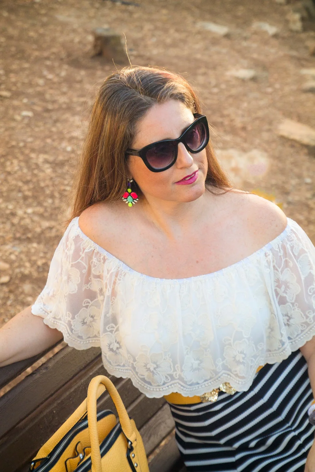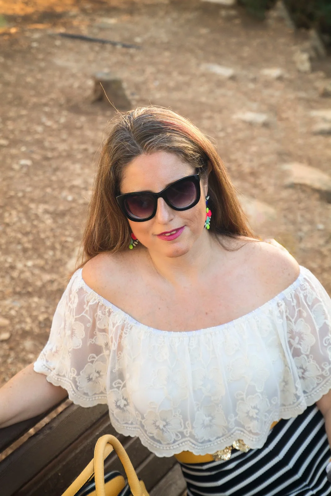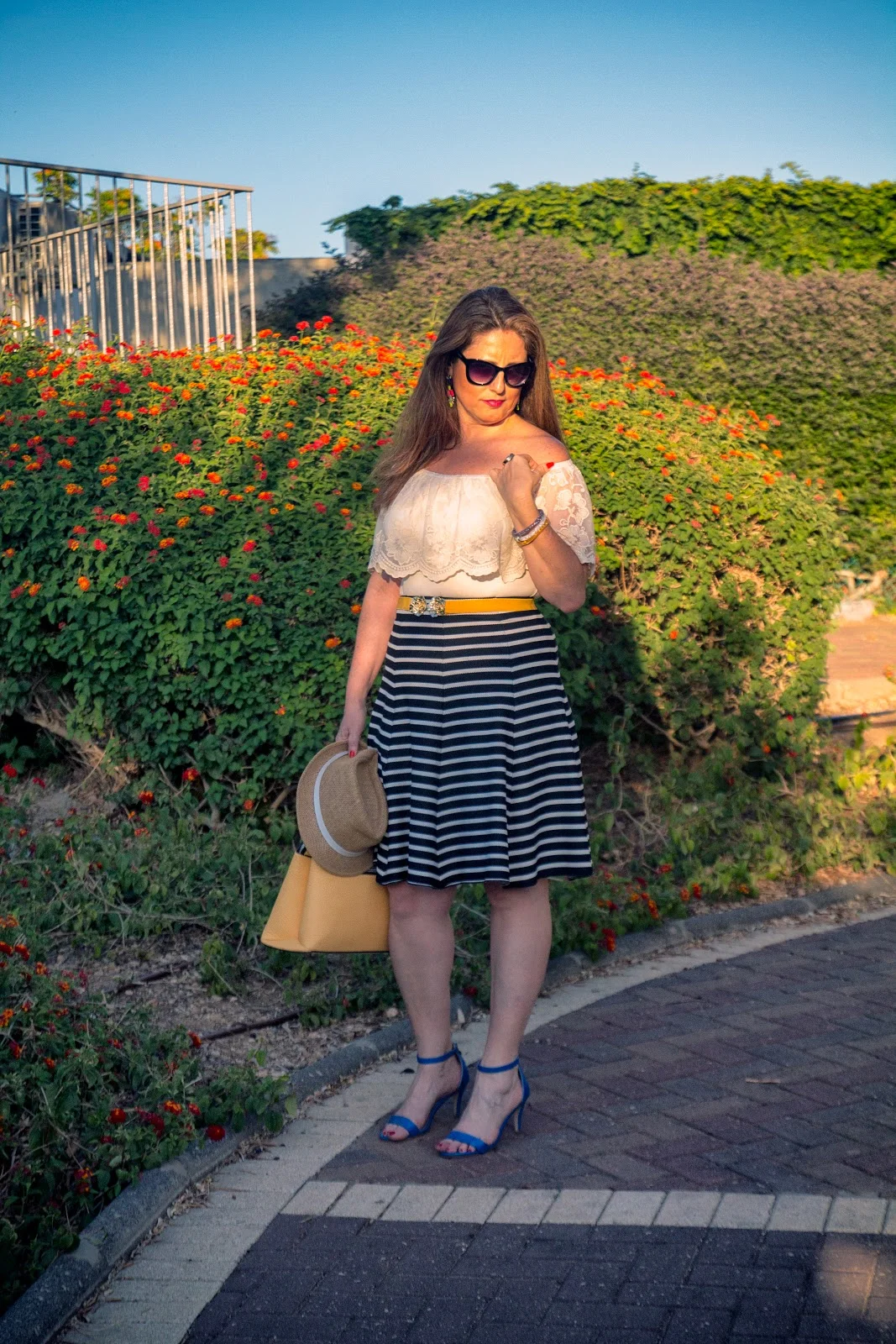 בחרתי בחצאית – גזרה A ובחולצה שהעונה אי אפשר לפספס – מחשוף הכתפיים ,מכיוון שבחרתי בחולצה בצבע שמנת (לא היה אותה בצבעוני-דווקא מאוד רציתי) את הצבעים הוספתי באקססוריז וכמה שיותר ,כמובן בהרמוניה.