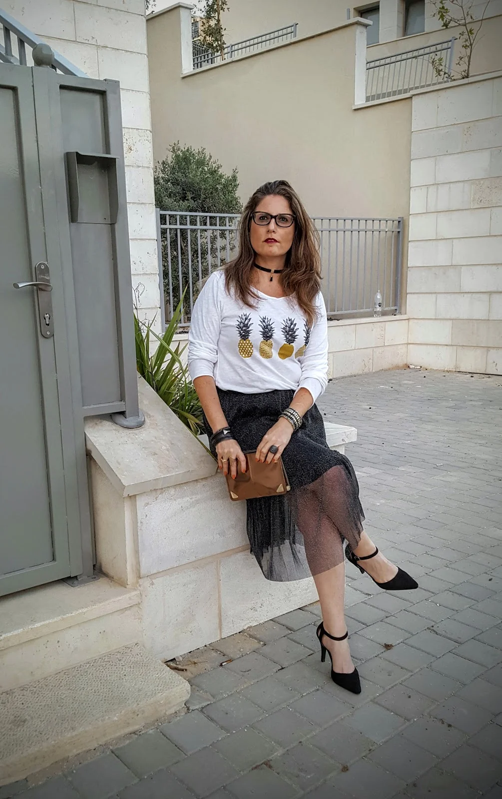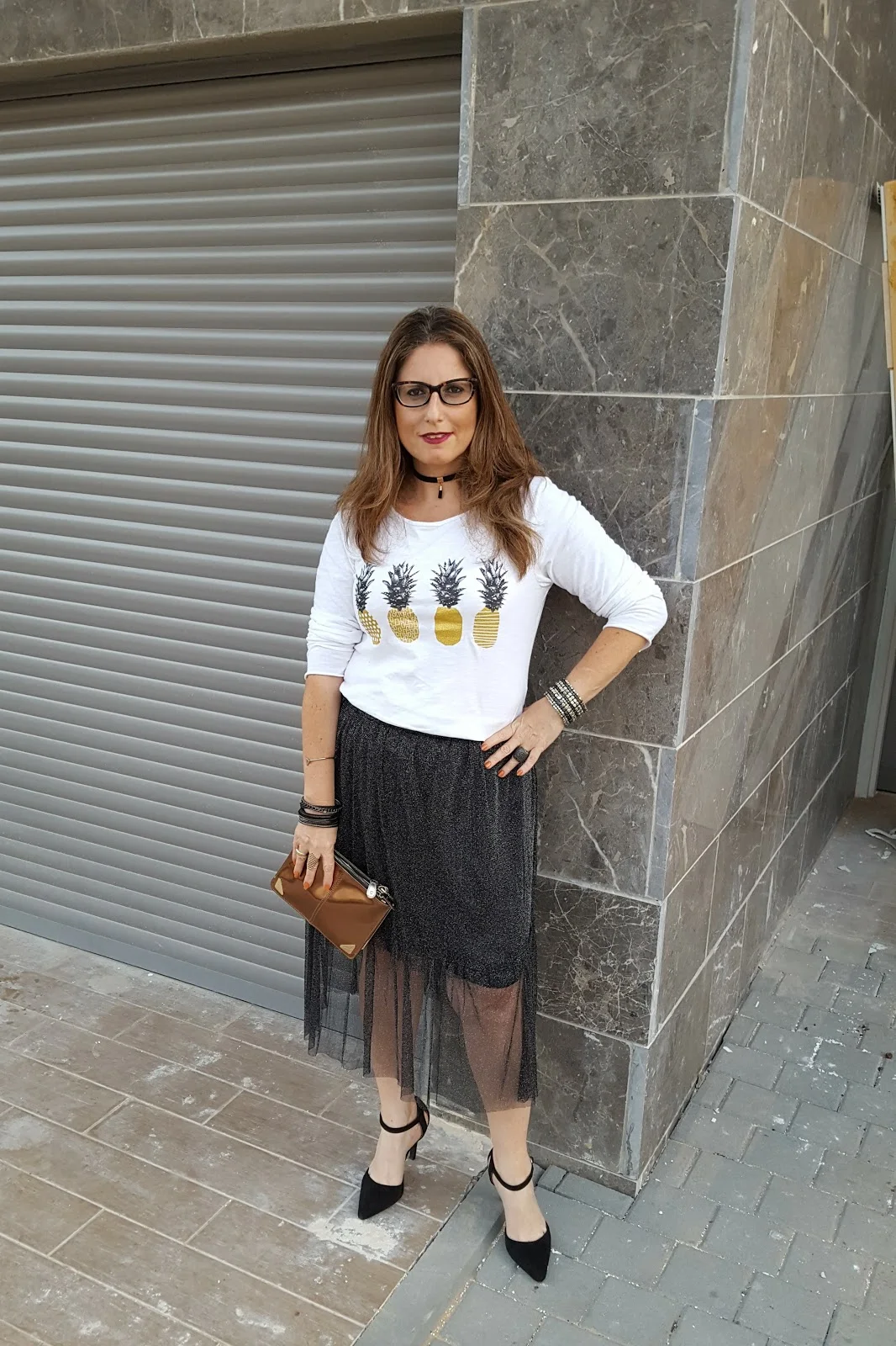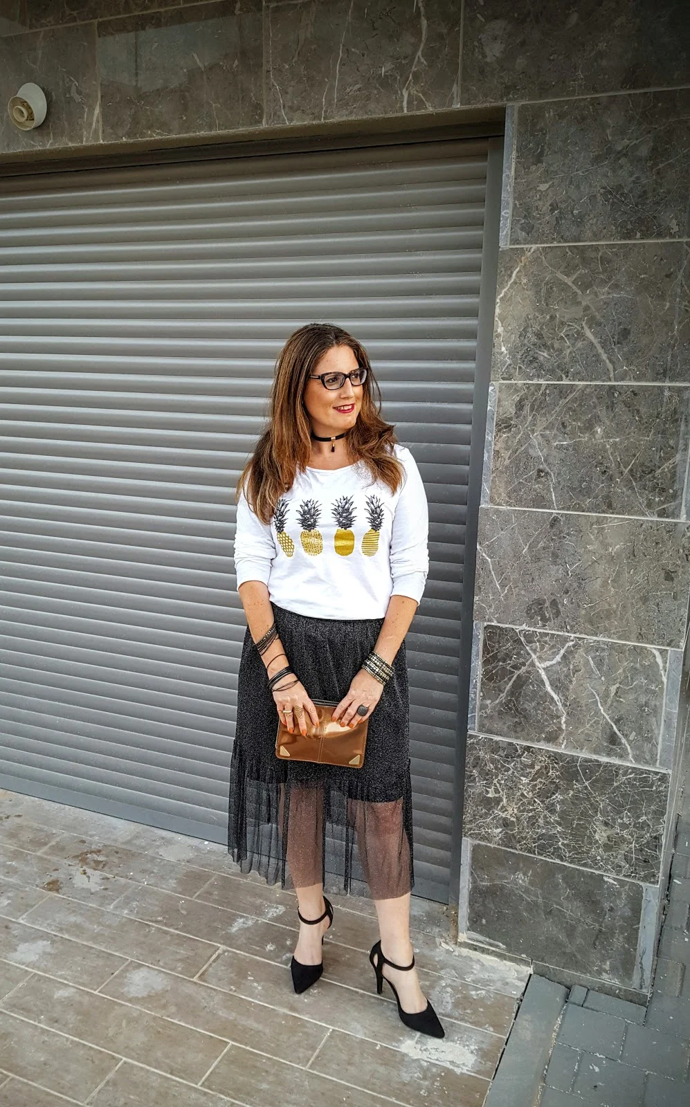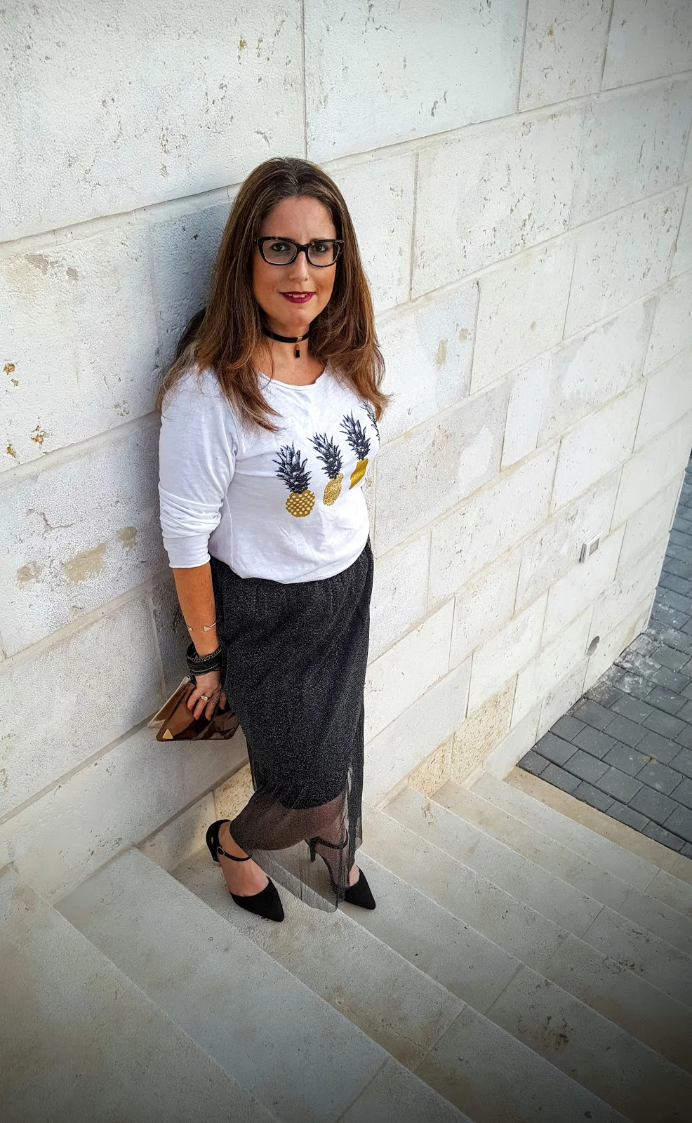 החצאית הזו היא הכי גלאם שיש ועל מנת שנוכל ללבוש אותה לא רק למסיבת סילבסטר או לאירוע מיוחד הכי מתאים שנחבר לה חולצת טי שרט שיכולה להיות לבנה חלקה ואם נרצה להיות מיוחדות אז כזו שאני בחרתי שיש בה כסף וזהב ביחד ולכן תשמש אותי פשוט לכל דבר ועוד עם אננסים אז בכלל…