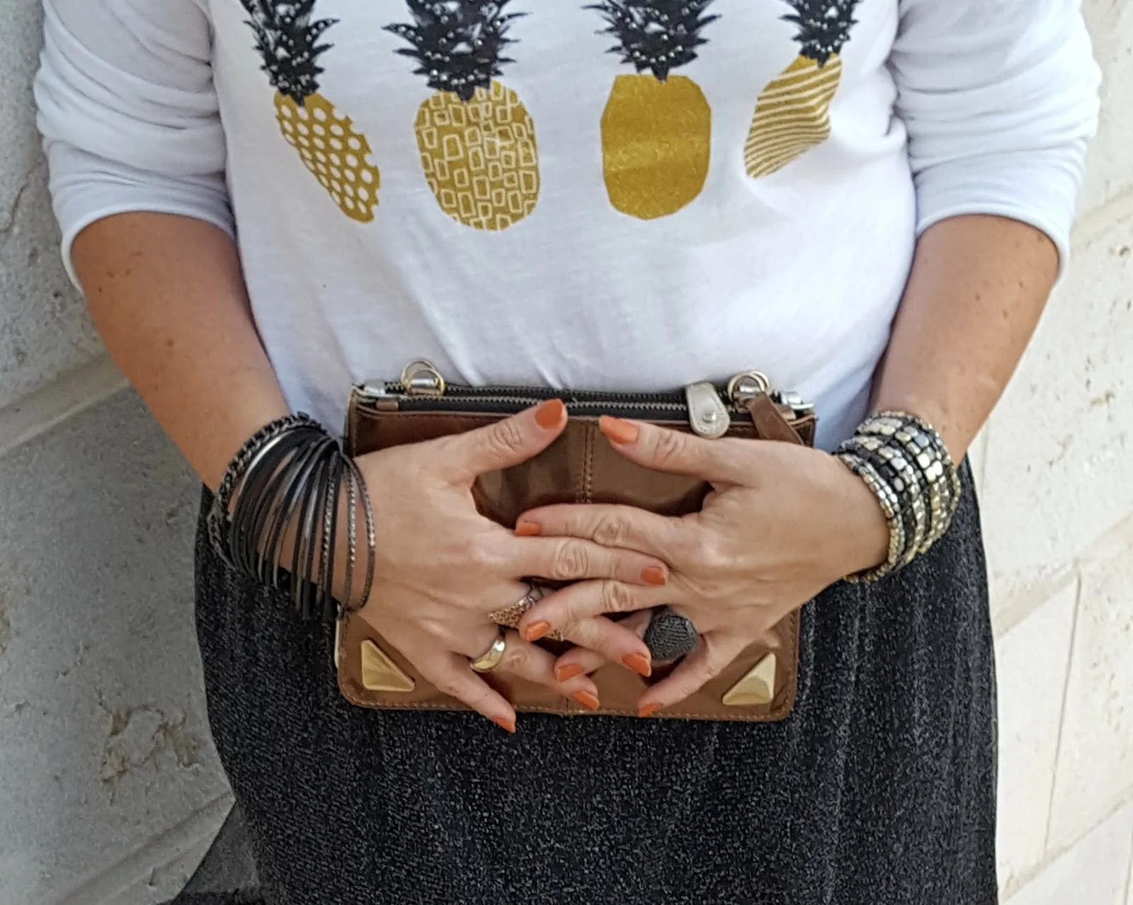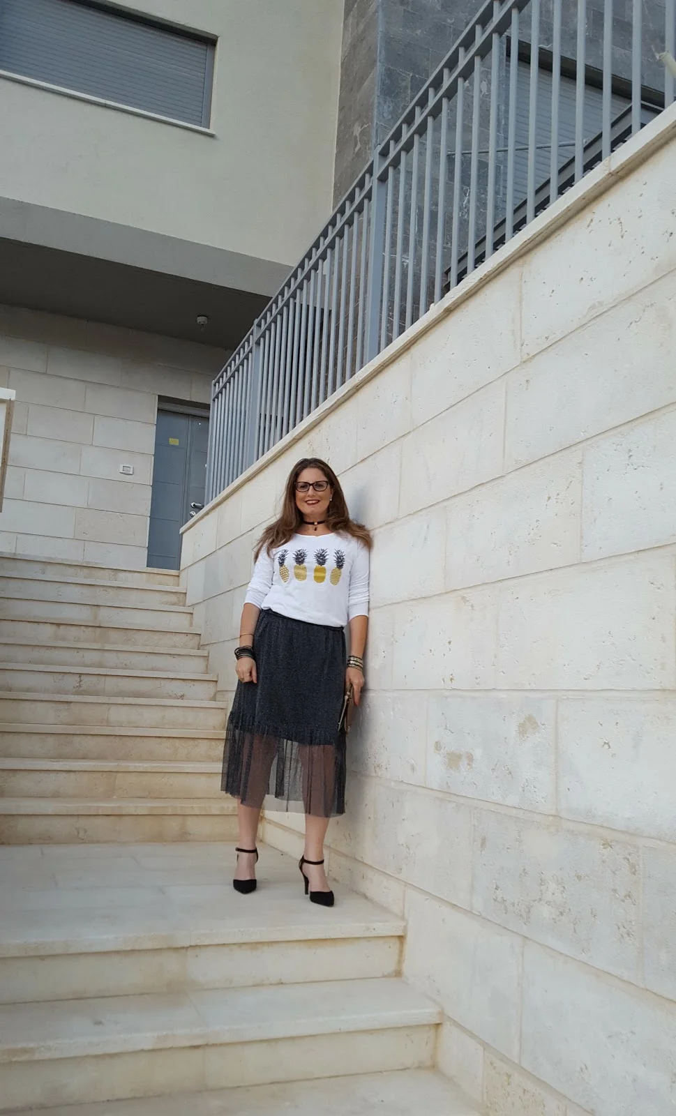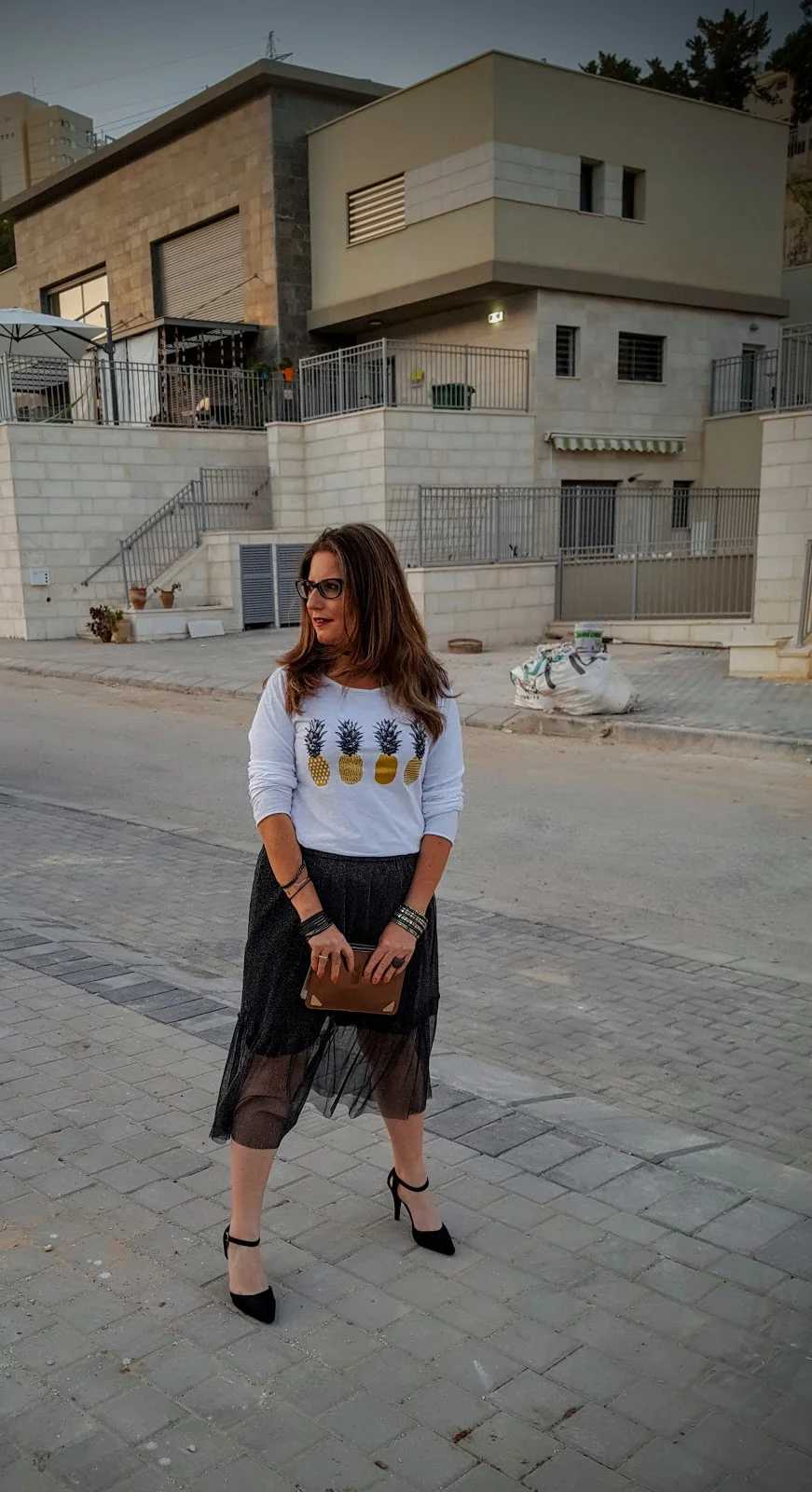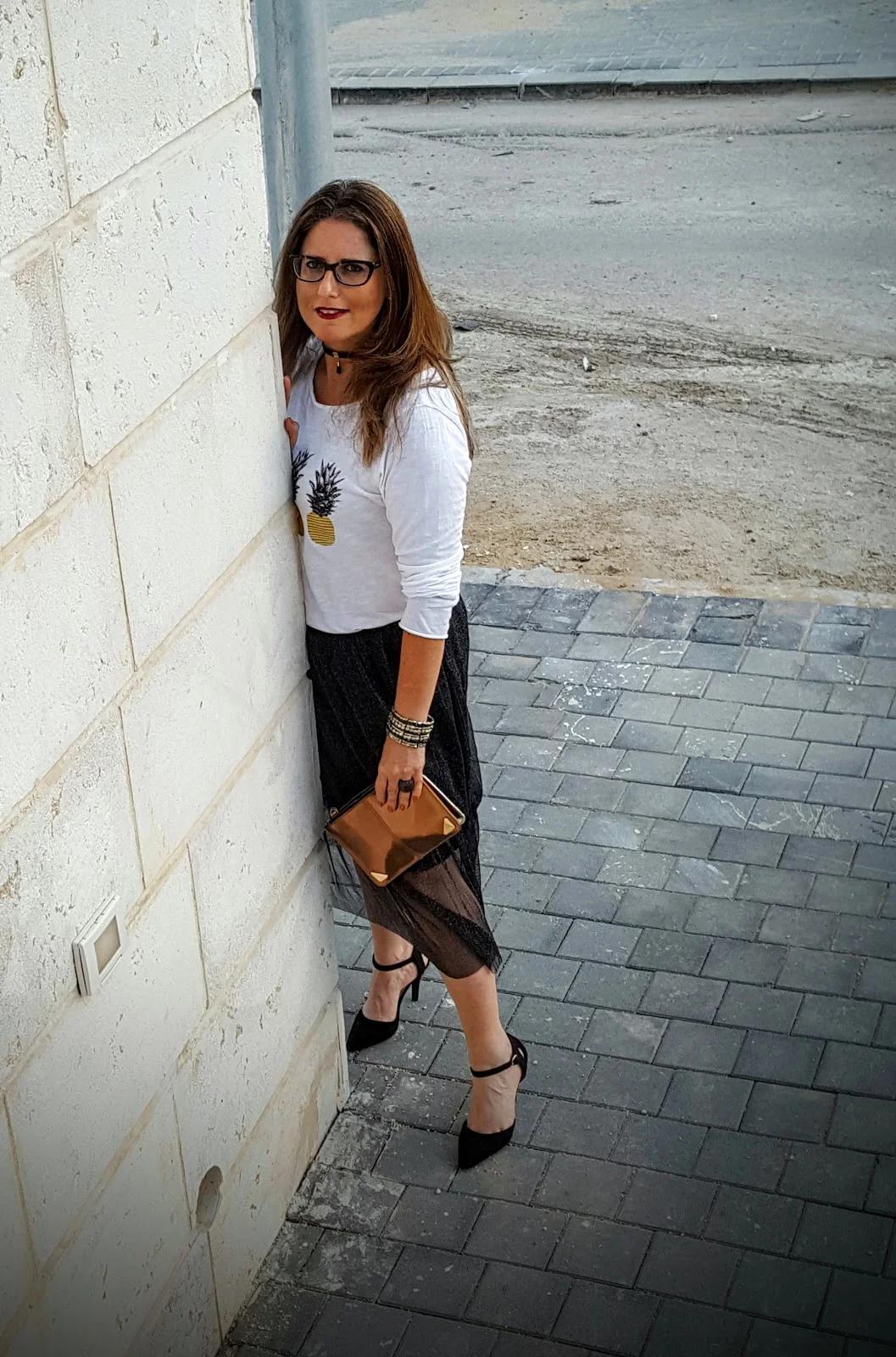 החצאית הזו היא הכי גלאם שיש ועל מנת שנוכל ללבוש אותה לא רק למסיבת סילבסטר או לאירוע מיוחד הכי מתאים שנחבר לה חולצת טי שרט שיכולה להיות לבנה חלקה ואם נרצה להיות מיוחדות אז כזו שאני בחרתי שיש בה כסף וזהב ביחד ולכן תשמש אותי פשוט לכל דבר ועוד עם אננסים אז בכלל…