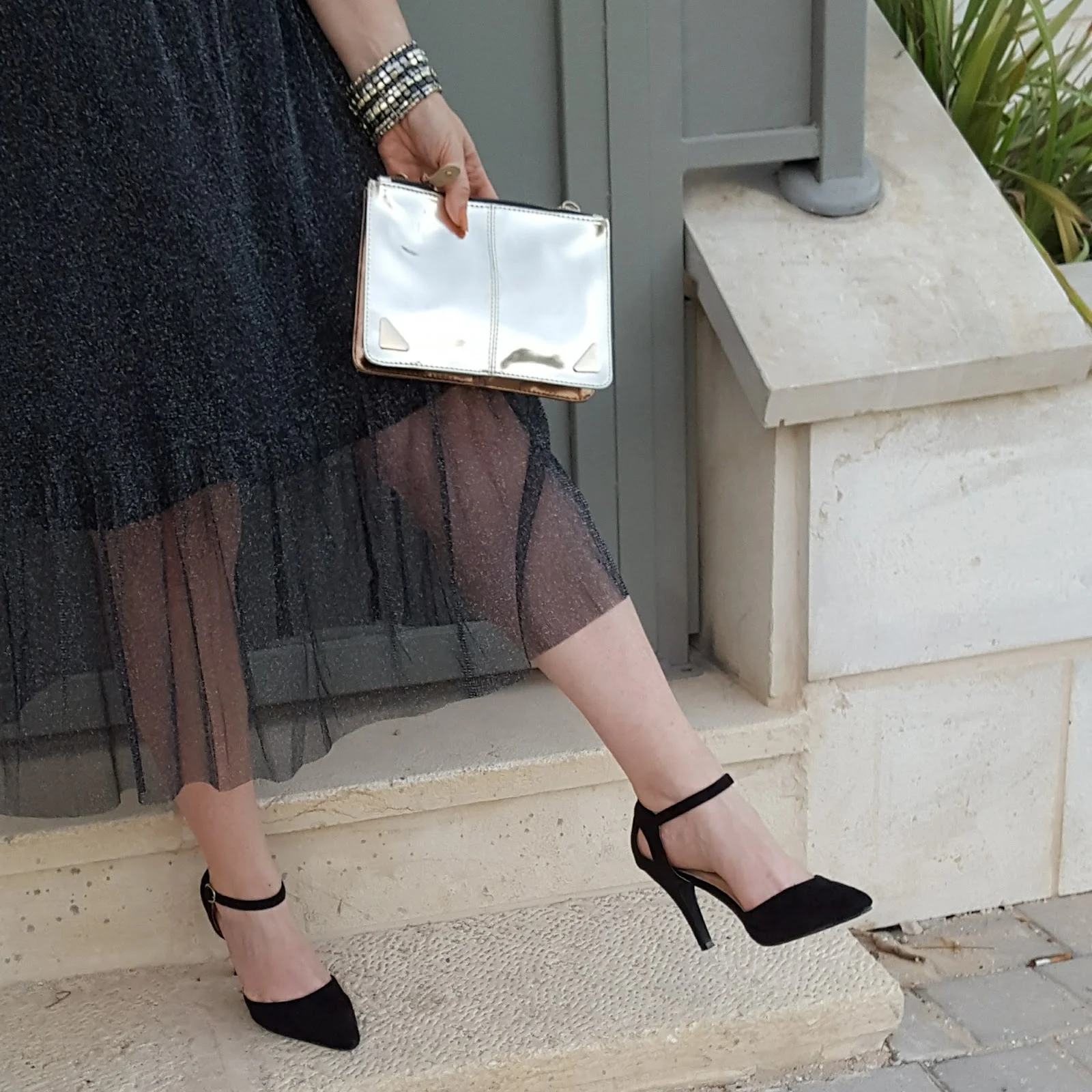 החצאית שאתן רואות היא גם שקופה למטה עם שכבה נוספת של פפלום, אפשר להגיד שכמה טרנדים ביחד. חשוב להדגיש שיש פריט מטאלי בהופעה הוא צריך להיות ייחודי וצריך להיות מרכז ההופעה ולכן יש לשים לב עם מה משלבים אותו .