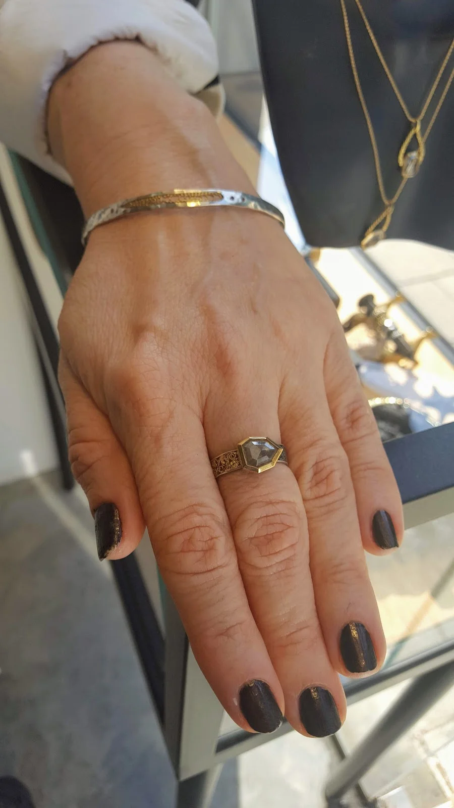 טבעת שבולט בה השילוב של העתיק והמודרני