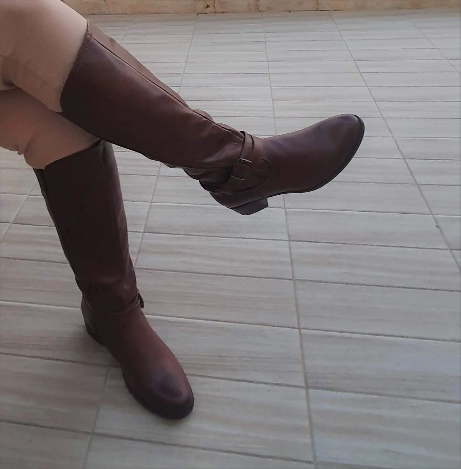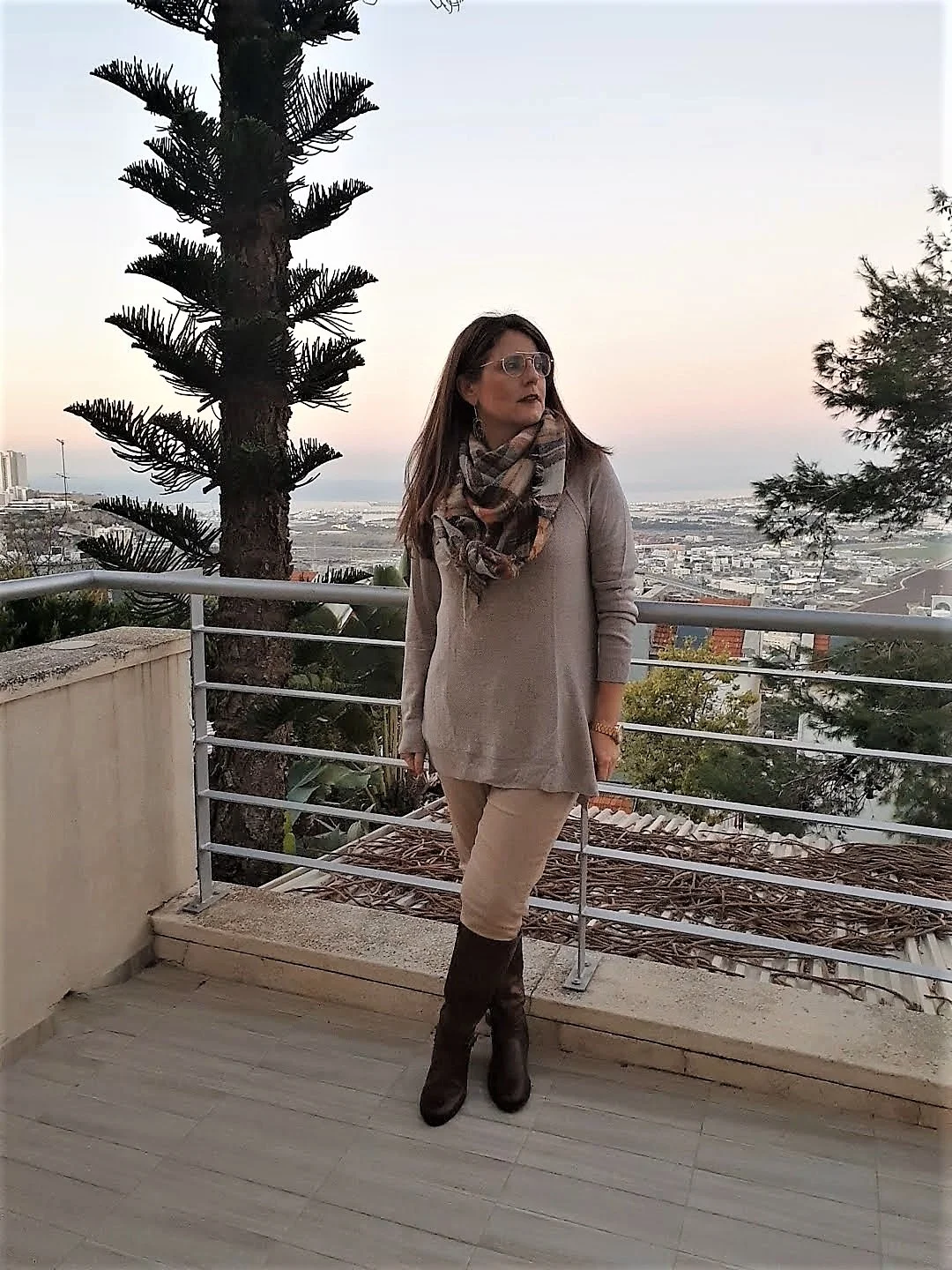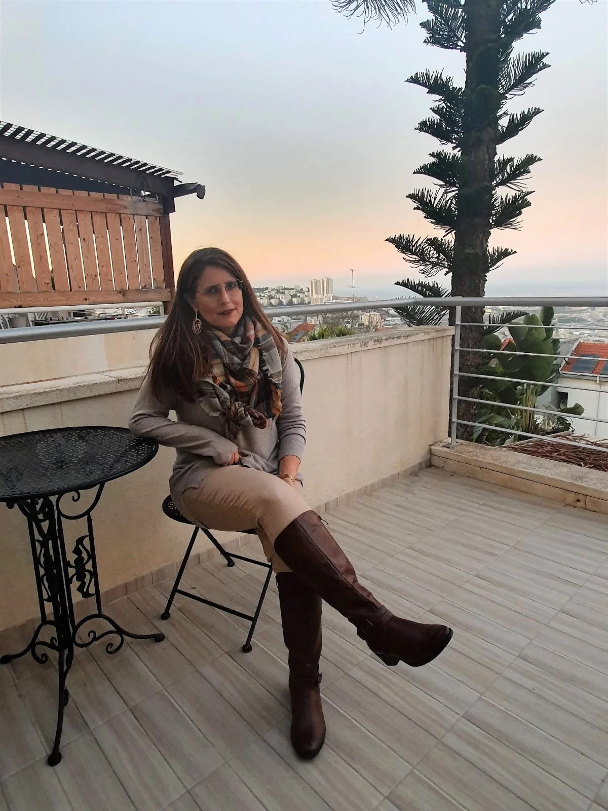 באפשרות עם המכנסיים בחרתי שיהיו ממשפחת החומים אומנם יותר בהירים ואת הצבע הכהה של המגפיים התאמתי בצעיף.