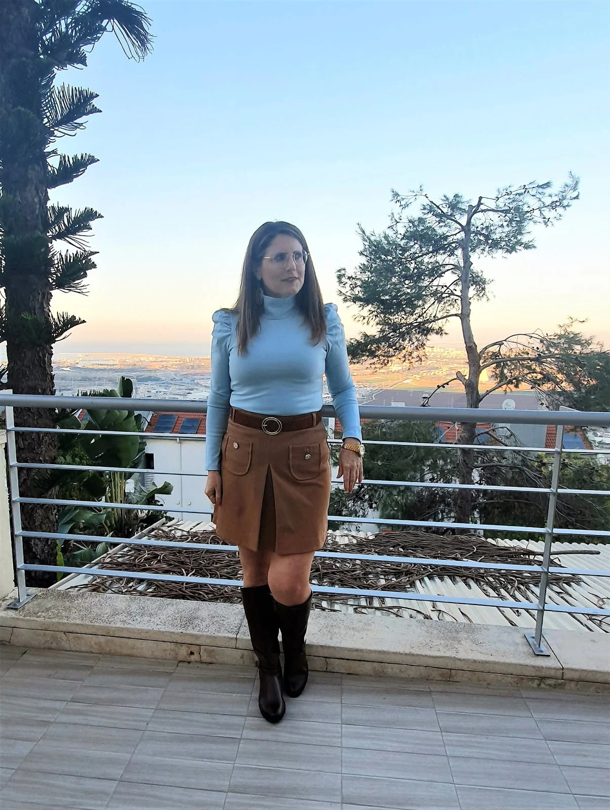 חצאית מידי תכלת וסריג חום מנצנץ ולהפך, חצאית מיני חומה וחולצה בתכלת עם השרוולים הנפוחים של העונה, משני הלוקים כמובן המגפיים החומים המושלמים מליידי קומפורט.