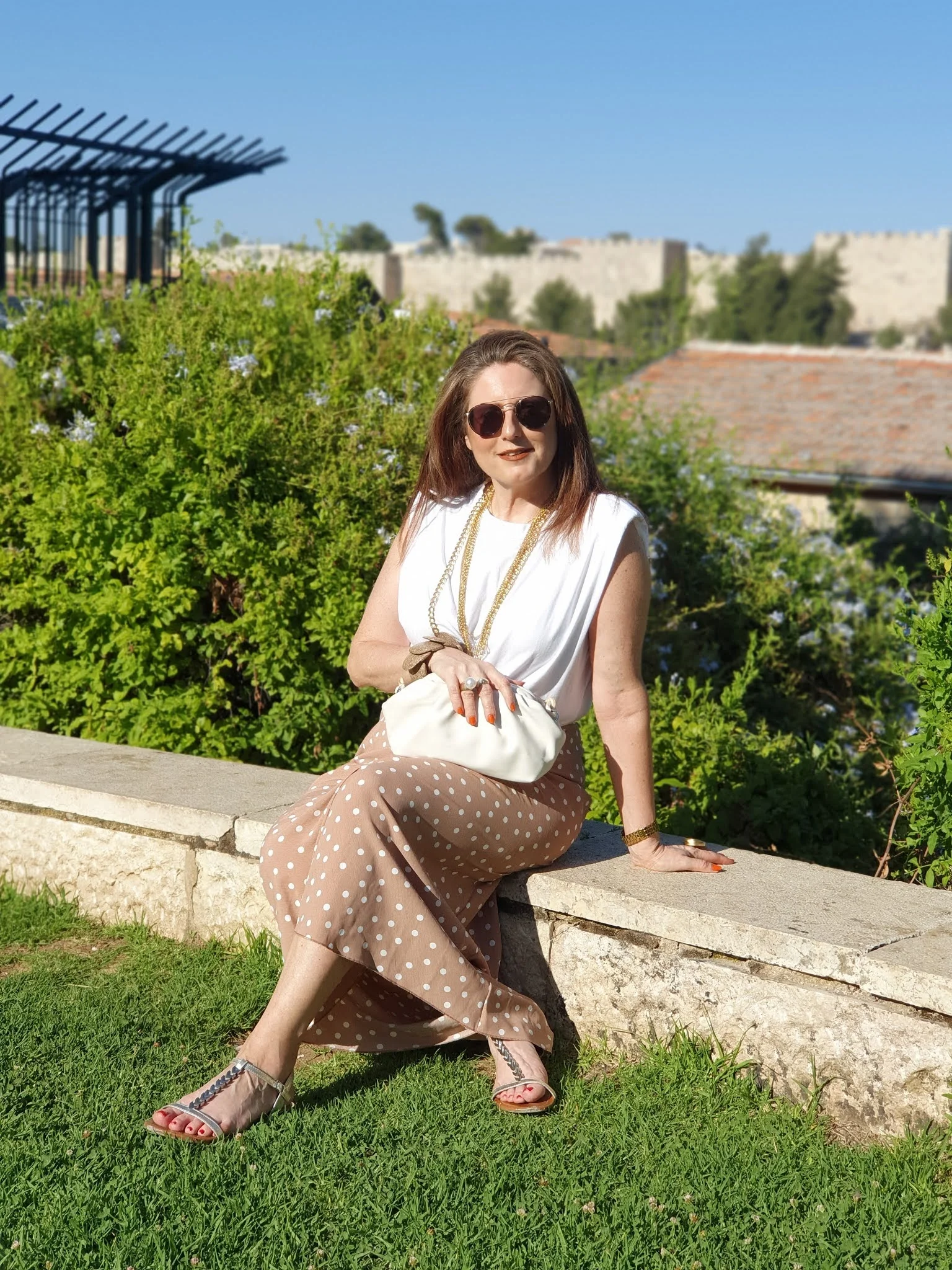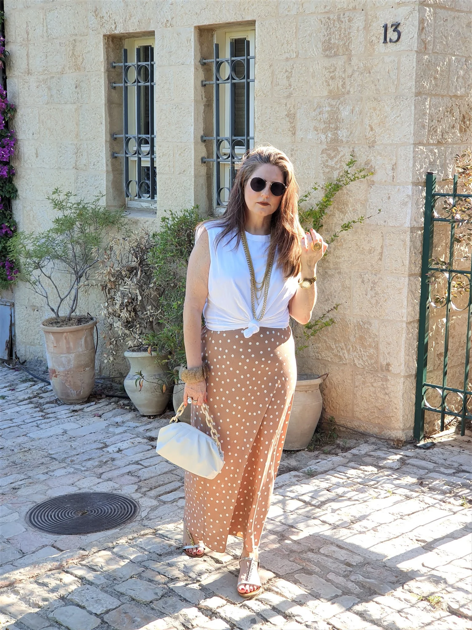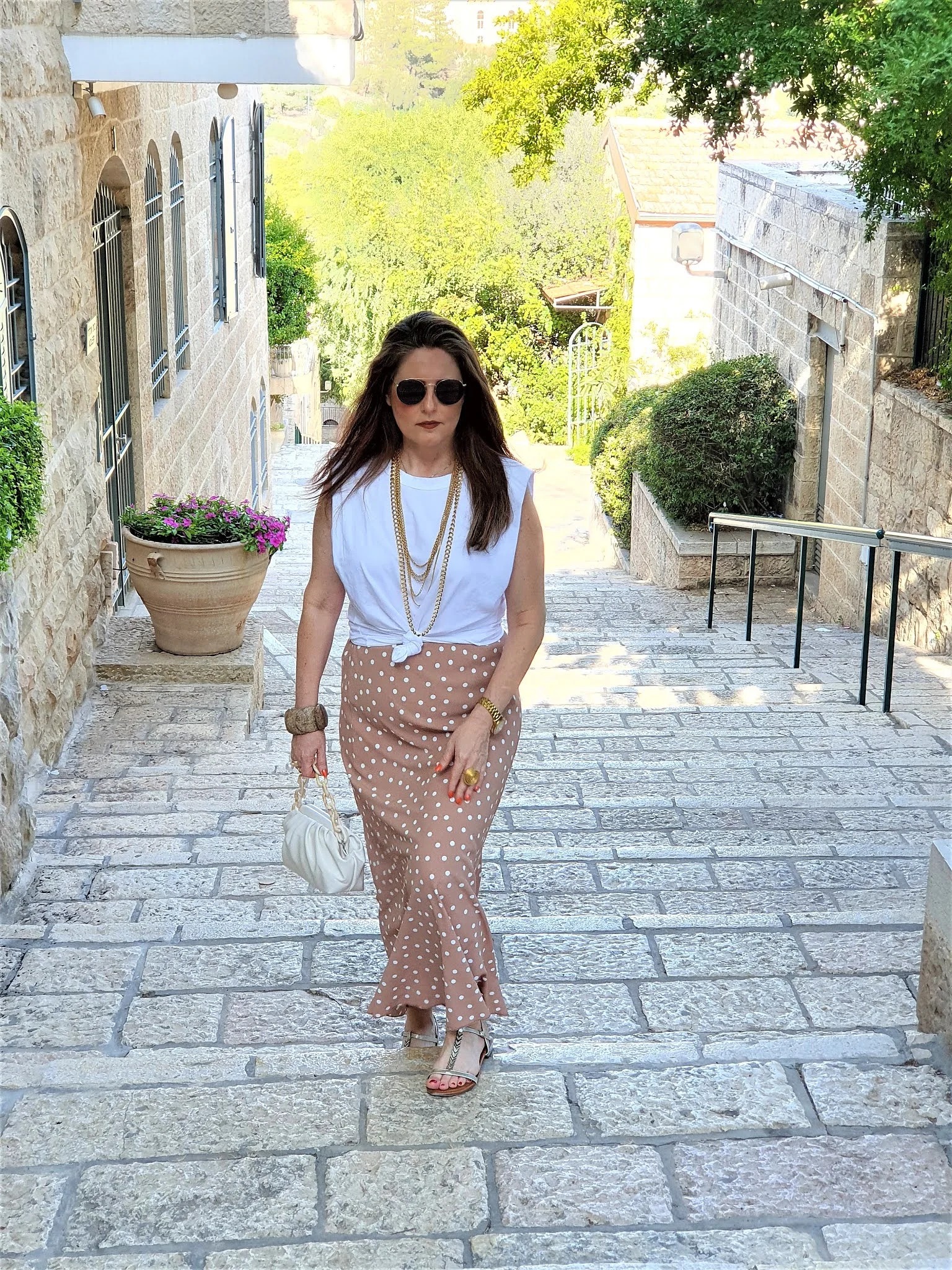 הלוק השני צולם בשכונת ימין משה – קז'ואל בשיק, חצאית מקסי עם פרינט נקודות והטי שרט הכי מפורסמת של העונה עם הכריות וסנדלים שטוחות.