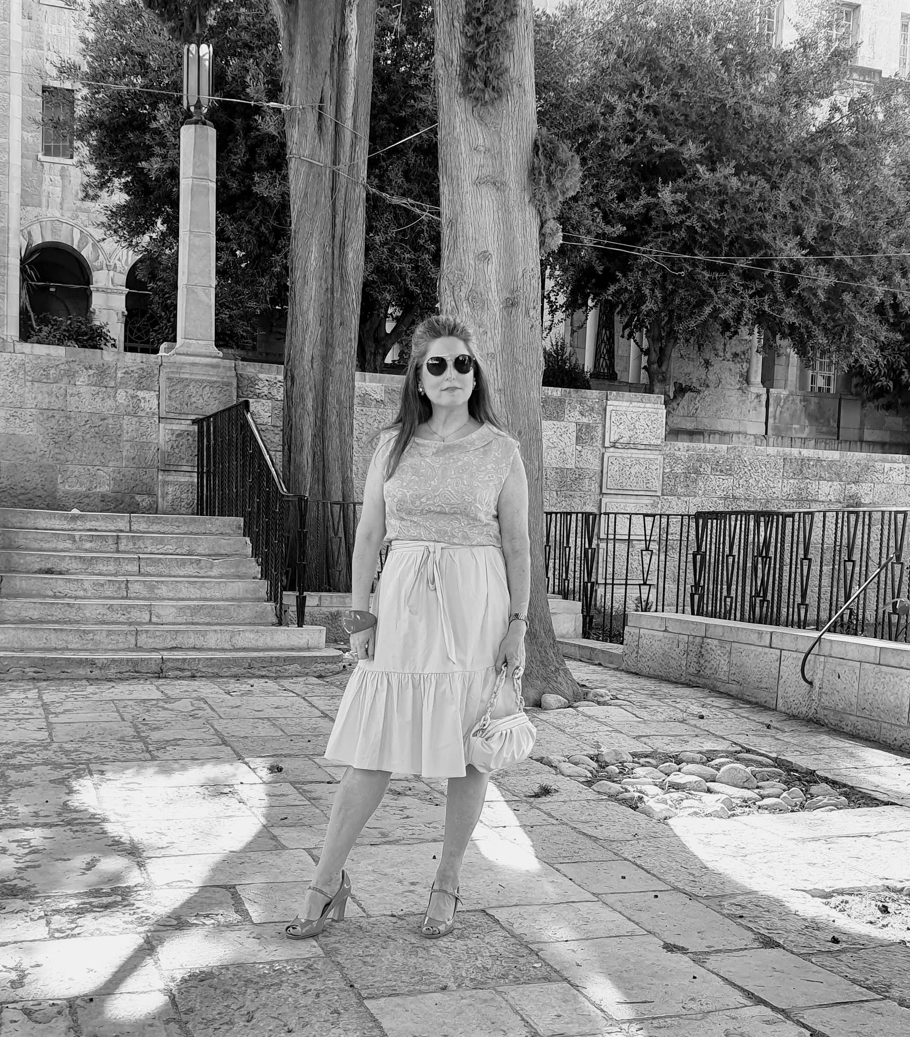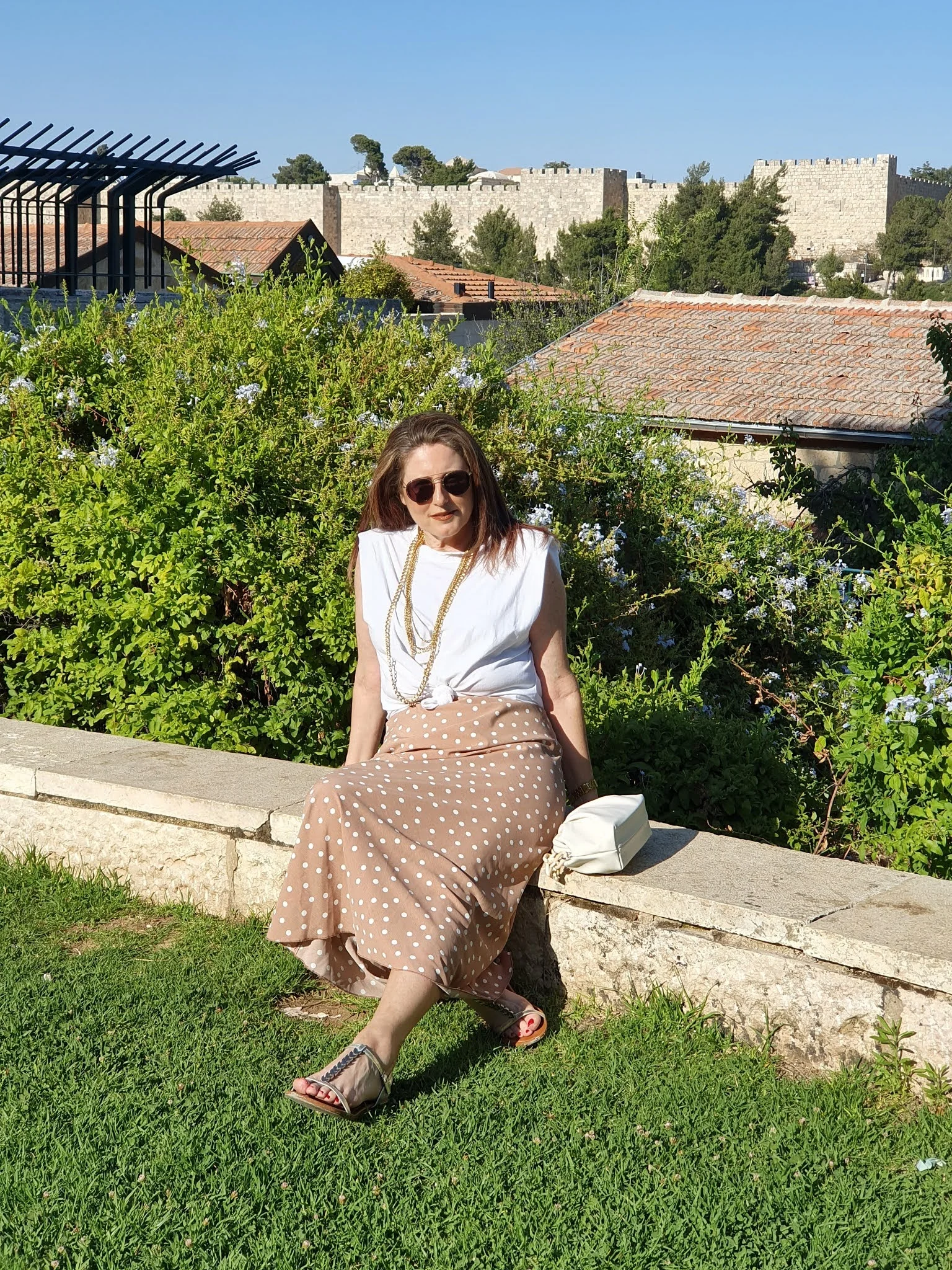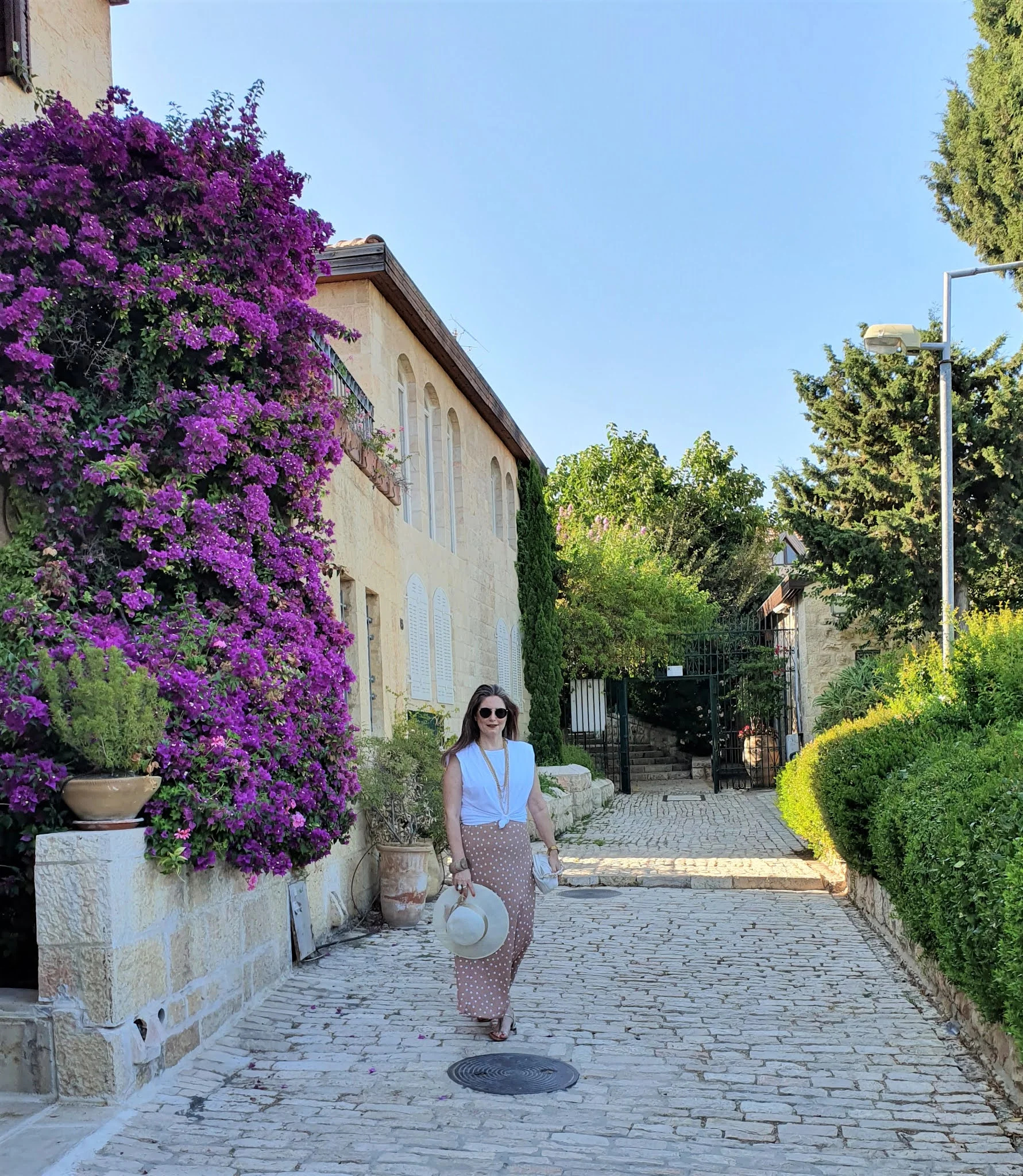 הלוק השני צולם בשכונת ימין משה – קז'ואל בשיק, חצאית מקסי עם פרינט נקודות והטי שרט הכי מפורסמת של העונה עם הכריות וסנדלים שטוחות.
