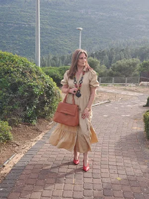 בחרתי להצטלם עם שמלה קלאסית שיש בה קצת מהטרנדים האחרונים ,שרוולים נפוחים וצבע הניוד.