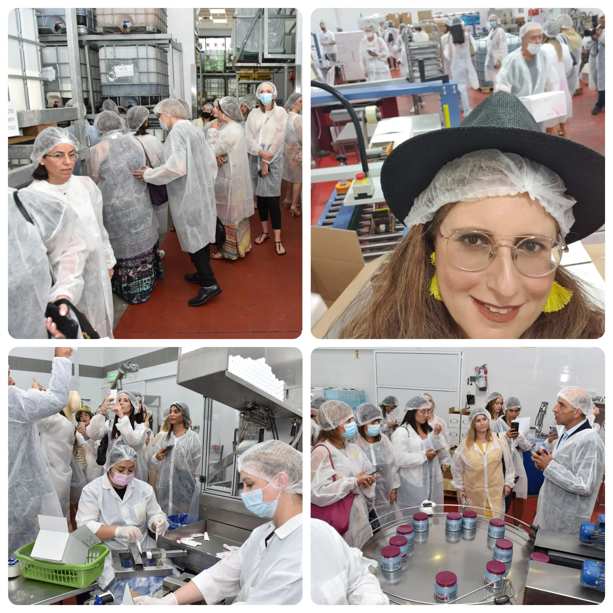 קיבלתי מזוודה עמוסה במוצרים ,חלוק לבן וכובע לשמירת סטרליות והמשכנו לסיור מעניין במפעל, בחדרי היצור, האריזה והמחסנים.