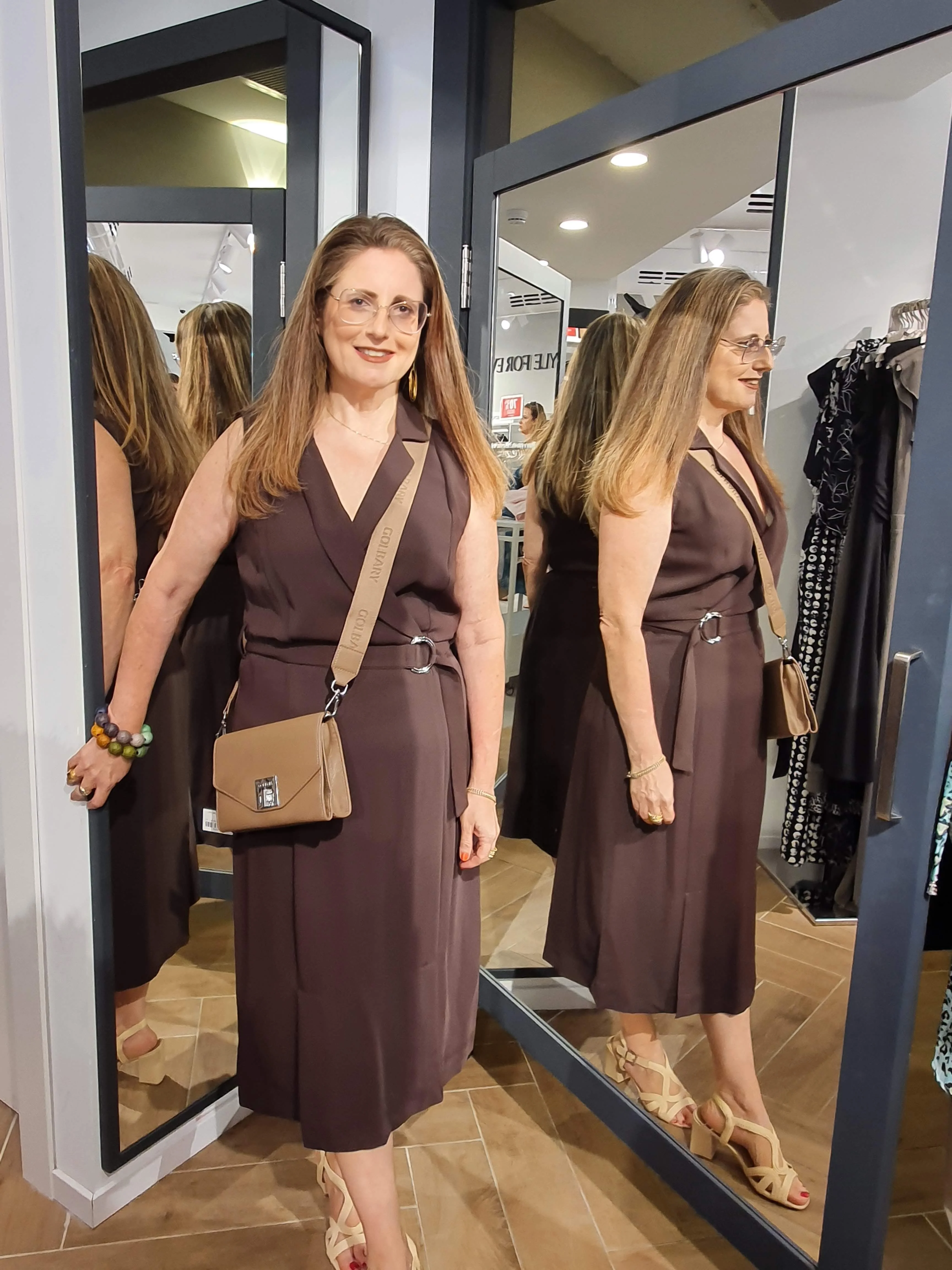 אמרתי שאני אוהבת חום נכון,מדדתי שמלה קלאסית מחמיאה ולוק שני מכנסיים מחטבים וחולצה יפיפייה בפרינט עם חום.