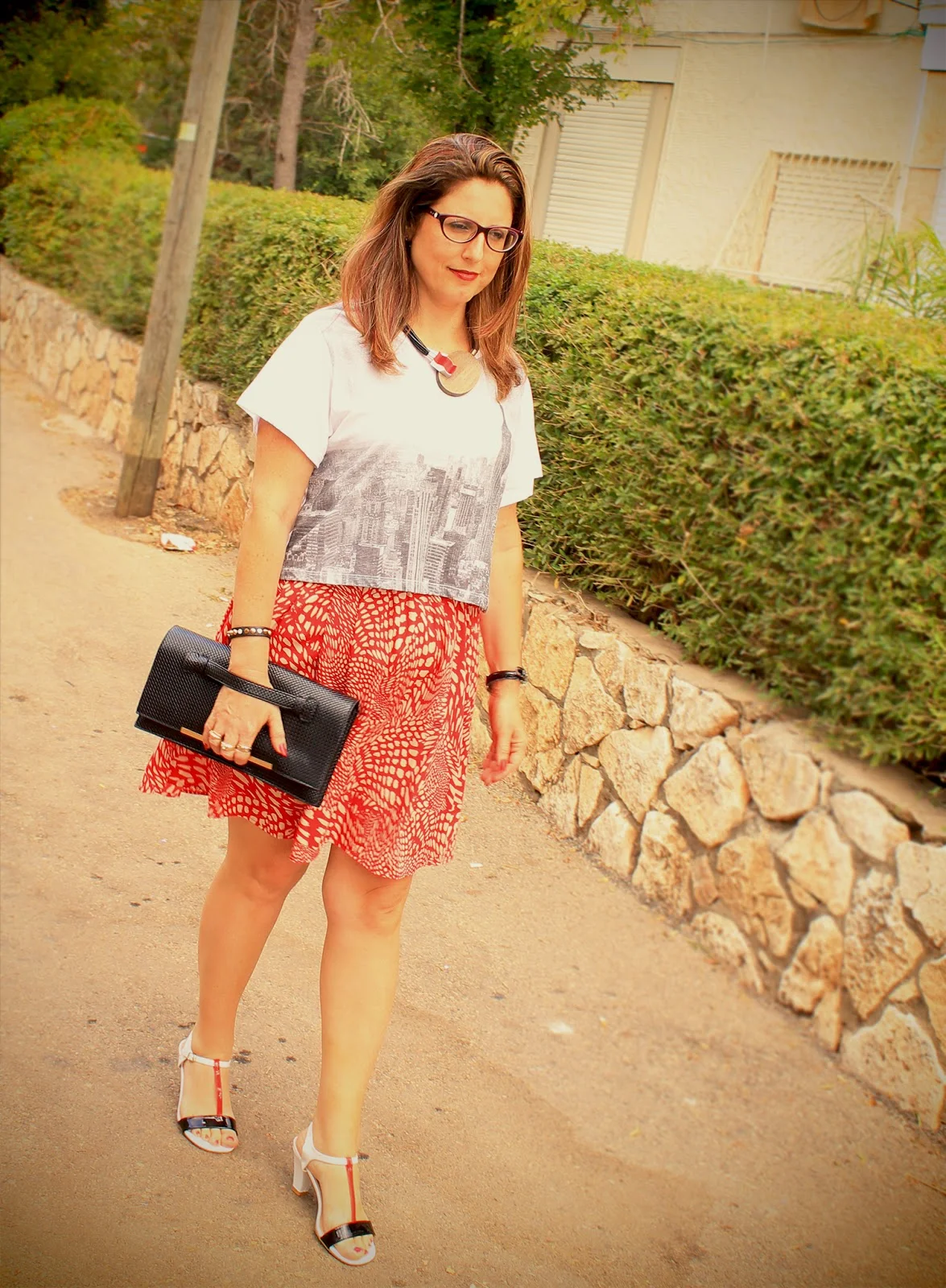 את האאוטפיט שבתמונות התחלתי להרכיב מהחצאית, רכשתי אותה באתר styleriver. אני בדרך כלל לא קונה בגדים באתרי האינטרנט אך אני "מסתובבת" שם  הרבה ובעיקר ב-styleriver ותמיד בודקת האם יש משהוא מענין ואטרקטיבי. (אקססוריז -תכשיטים ותיקים קניתי והיה מוצלח מאוד) מאוד התלהבתי מהחצאית ,קיצית ,אוורירית, הדפס מענין  והכי חשוב רציתי חצאית  שמשולב בה ...
