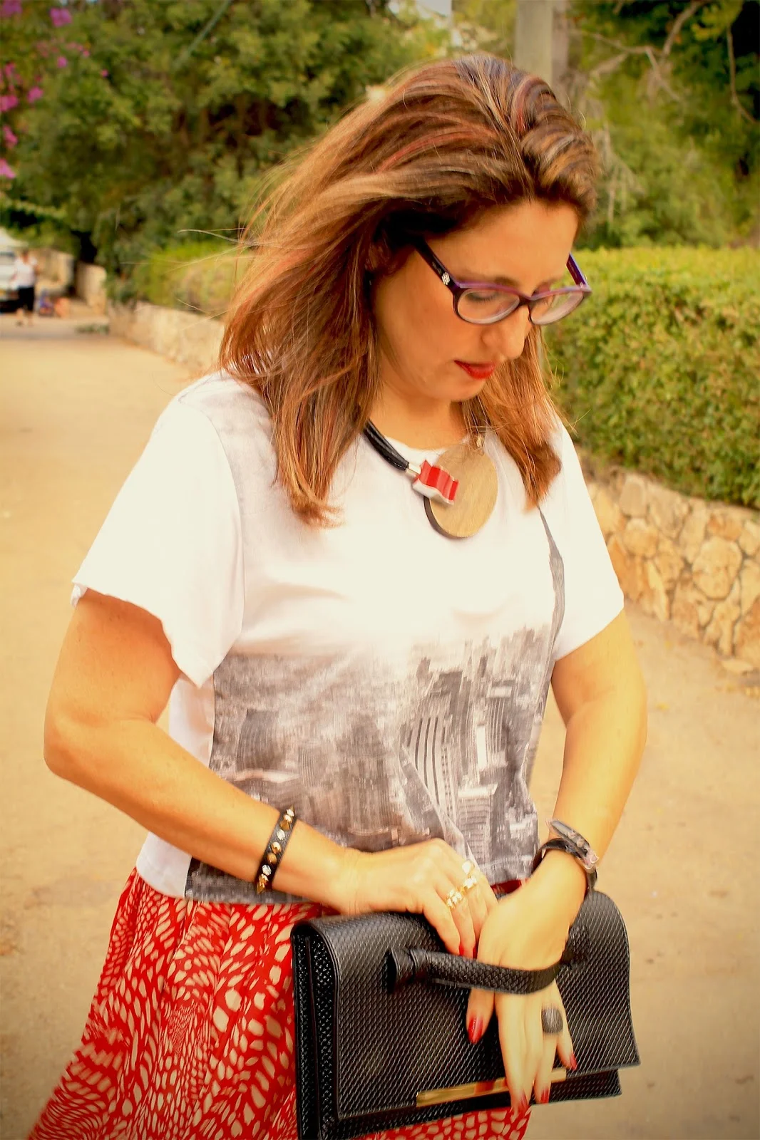 שילובי הדפסים- כאשר אנחנו רוצים לשלב פריט (מכנס,חצאית- כמובן שגם ההפך הוא כנ"ל) שיש בו הדפס ורוצים ללכת על בטוח יהיה הכי פשוט לבחור בחולצה חלקה שצבעה יהיה אחד הצבעים או גוון דומה לזה שקיים בפריט. במקרה שלי חולצה לבנה או אדומה ואפשרי גם שחורה(שמתאים להכול) תהיה תשובה הנכונה.